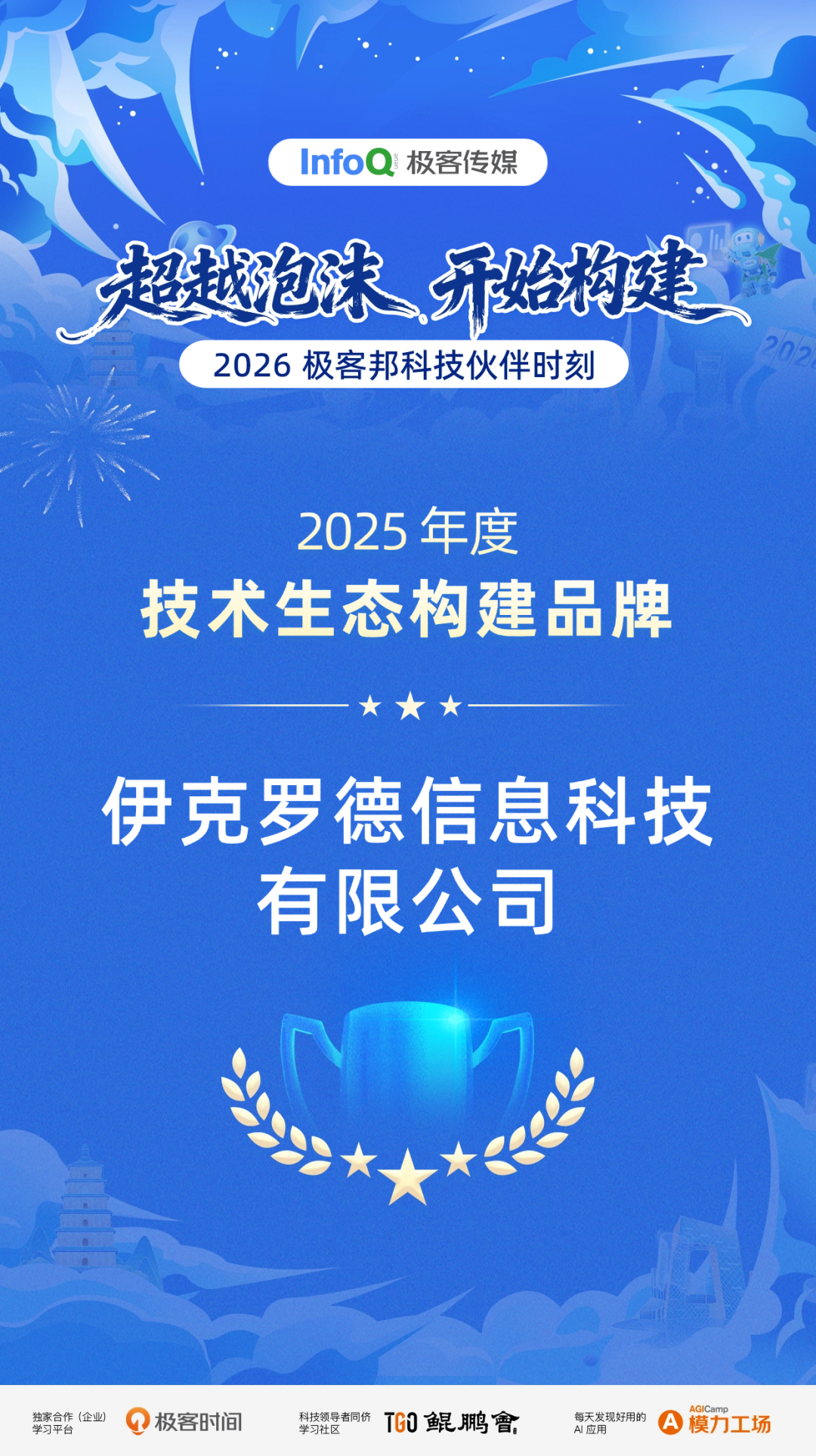 在合作伙伴颁奖环节,伊克罗德信息凭借在技术生态领域的持续投入与卓越贡献,荣获 InfoQ 极客传媒2025年度技术生态构建品牌奖。
