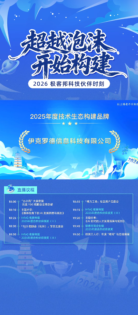 1月21日,以“超越泡沫,开始构建”为主题的2026极客科技伙伴时刻圆满结束,这是一场洞察趋势、聚焦价值、致敬生态共建者、共话成长的云端盛会。