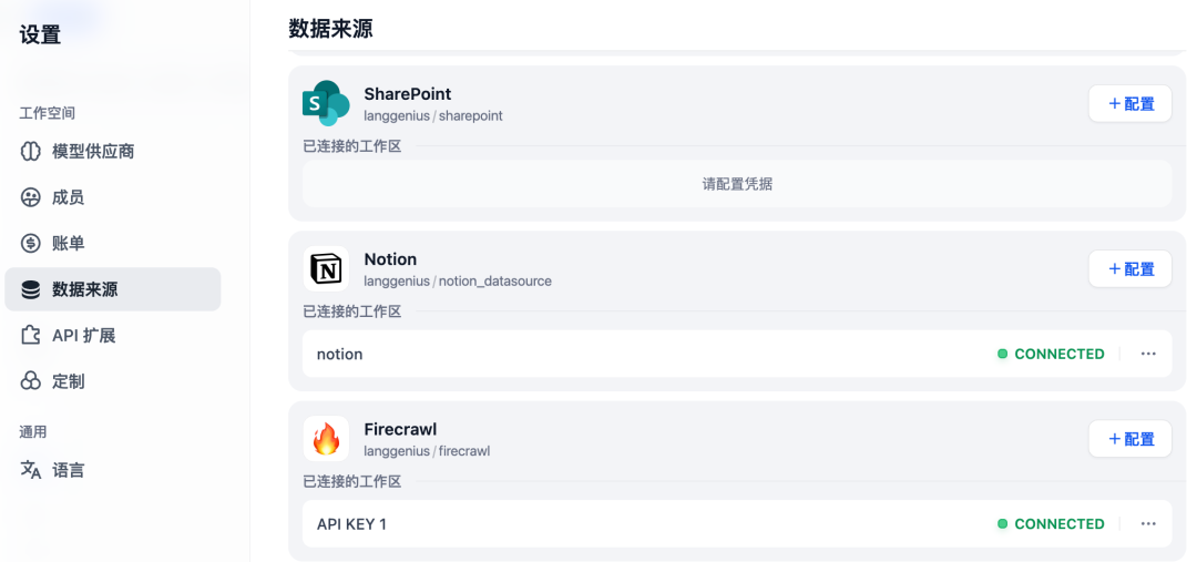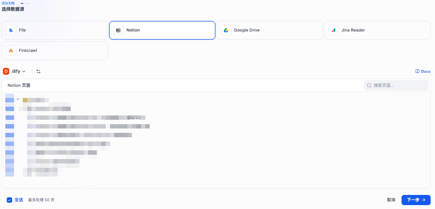 3.选择 Notion 数据源,将产品文档导入到知识库中: