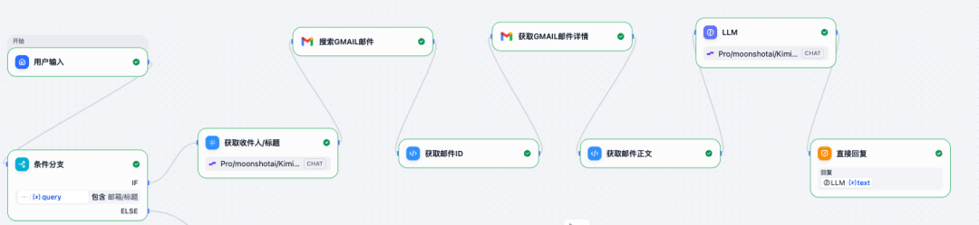 1.首先创建 ChatFlow 应用:添加邮件节点,LLM 节点,代码执行节点等,串通从数据获取到数据分析的全流程: