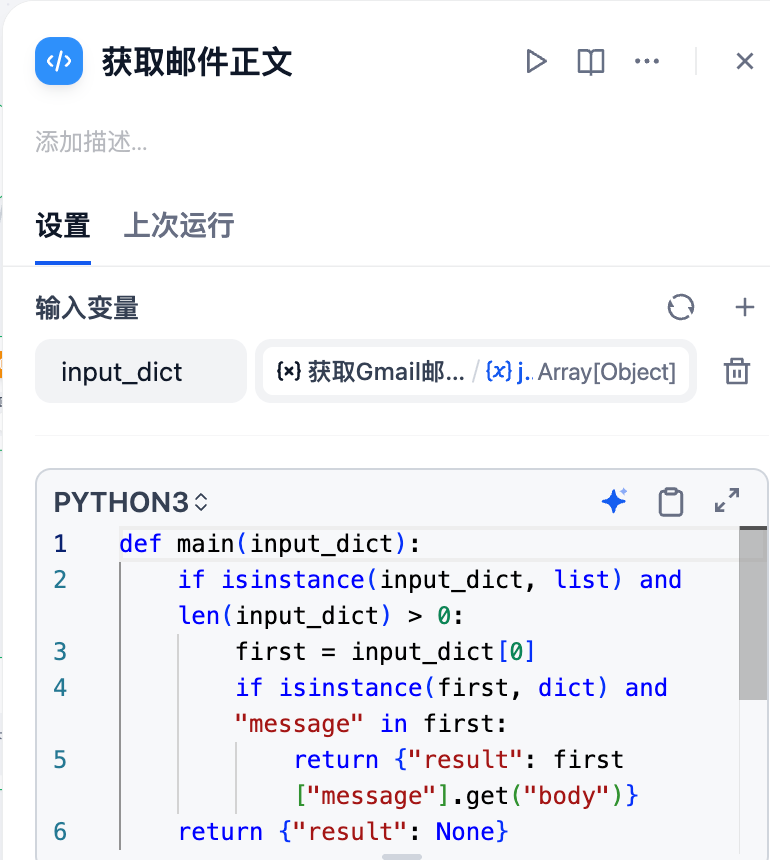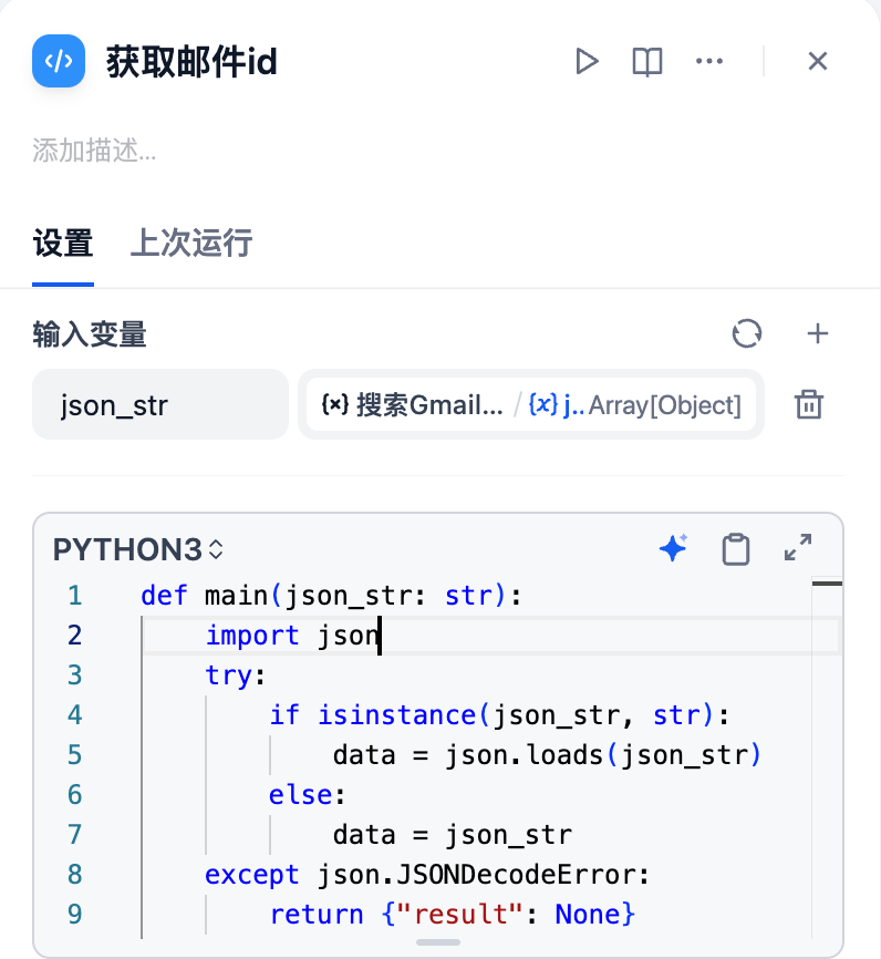 获取邮件 id 节点:通过代码执行器提取邮件唯一 id 标识符,用于后续工具的内容提取