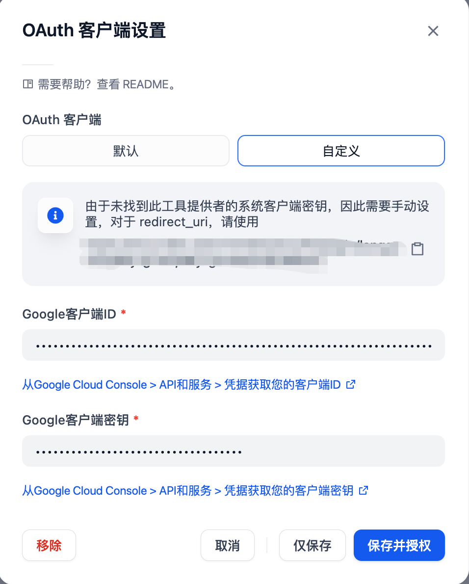 2.授权 Gmail 的 OAuth 认证:让工具能够获取到邮件的正文,具体配置步骤可参考下面的链接:https://docs.dify.ai/zh/develop-plugin/dev-guides-and-walkthroughs/tool-oauth