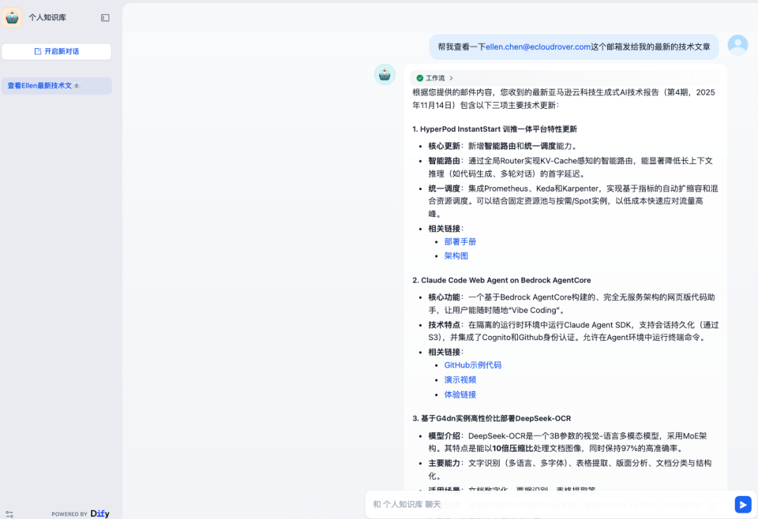 技术人员日常需处理海量邮件,其中夹杂着厂商推送的技术分享、行业干货等有价值内容,但这类邮件常被淹没在收件箱中,后续想追溯学习时,仅凭记忆查找效率极低。借助 Dify 搭建的 AI 知识助手,无需手动翻阅邮箱,只需输入发件人、邮件标题等关键信息,即可快速定位目标邮件并提取核心正文,其核心操作步骤如下: