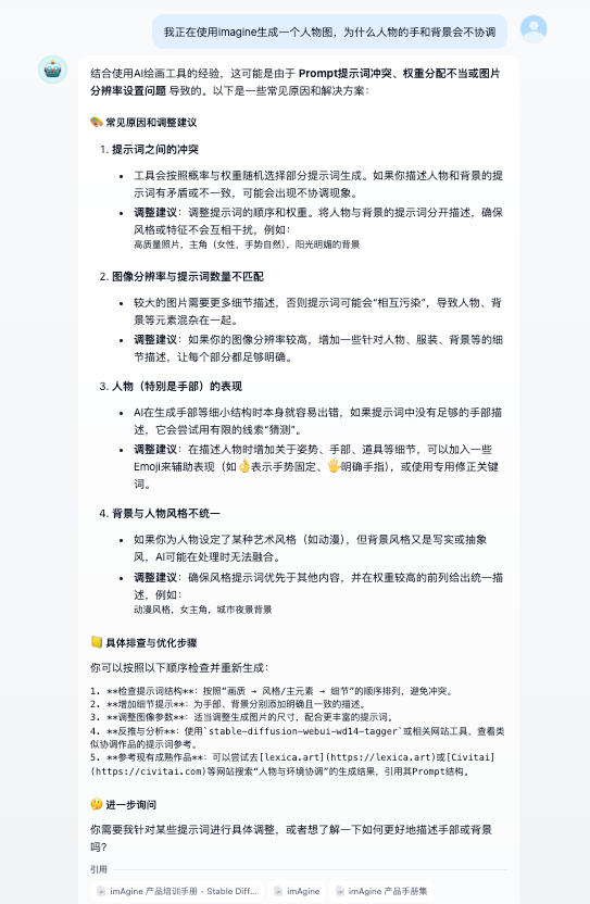 当客户提出问题时,例如:“生图人物手部和背景不协调怎么办?”,售前只需要通过自然语言将问题描述给 AI,大模型就会检索你 Notion 中的所有关联文档,像从《培训手册》中提取出“手部修正专用 Negative Prompt 组合”,从《技术方案》中提取出:“针对背景一致性的环境光影参数设置”等,然后结合这些内容给出对应的方案和建议。
